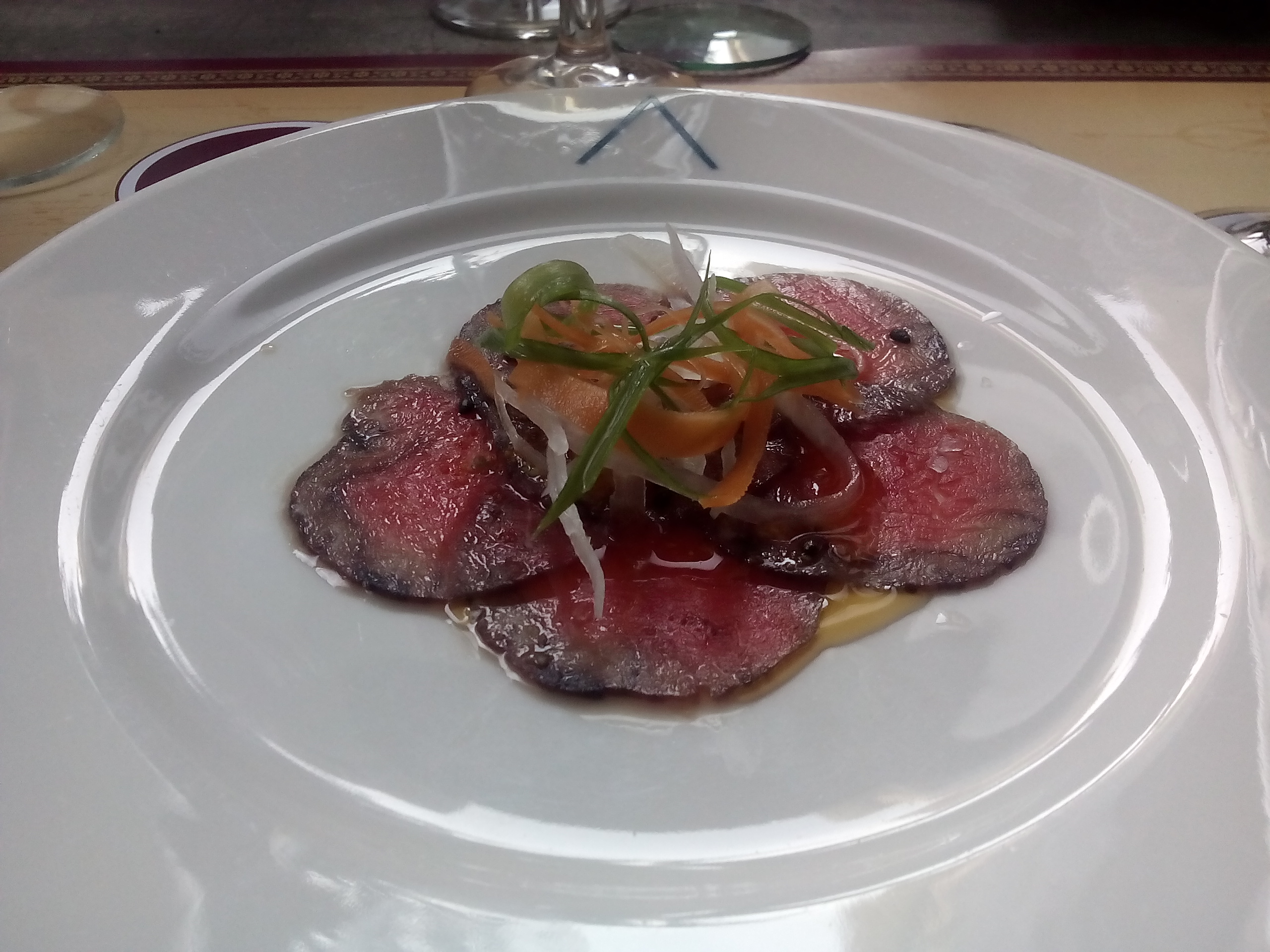 2.Beef carpaccio: red wine cured, shaved ginger, togarashi spice